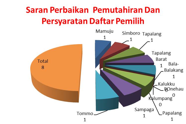 Bawaslu Kabupaten Mamuju juga mengeluarkan saran perbaikan pada Tahapan pemuktakhiran & penyusunan daftar pemilih. Saran ini mencerminkan distribusi rekomendasi yang diajukan Bawaslu untuk meningkatkan kualitas pelaksanaan Pemilihan Serentak Tahun 2024.