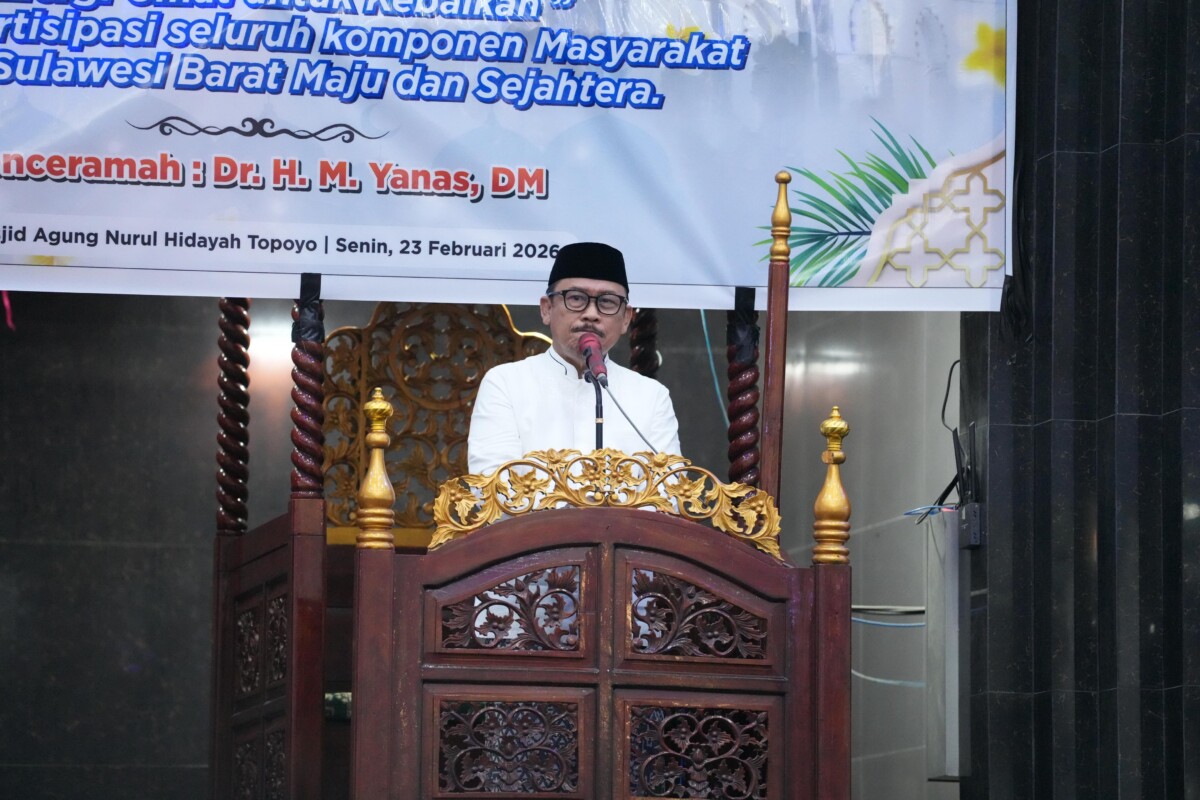 Topoyo, Mesakada.com — Gubernur Sulawesi Barat, Suhardi Duka, melaksanakan Safari Ramadan 1447 Hijriah di Masjid Nurul Hidayah Topoyo, Kabupaten Mamuju Tengah, Senin malam (23/2/2026). Kegiatan tersebut menjadi momentum silaturahmi sekaligus penyampaian pesan pembangunan dan kebangsaan kepada masyarakat.